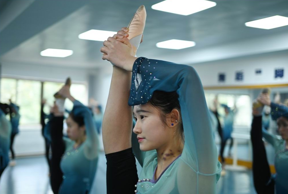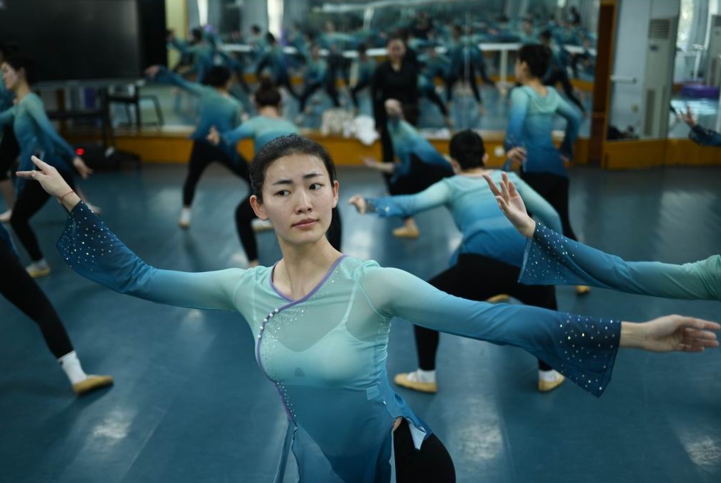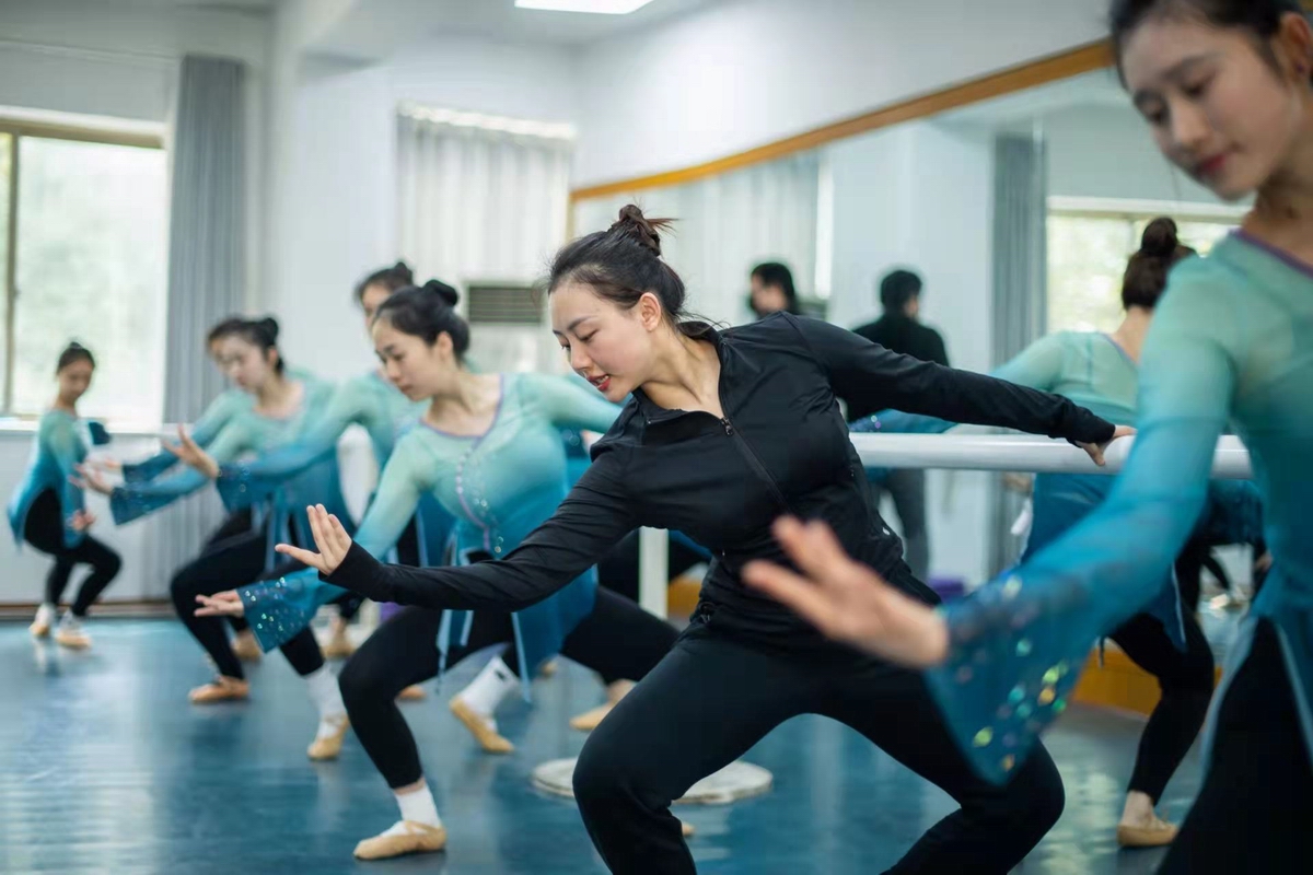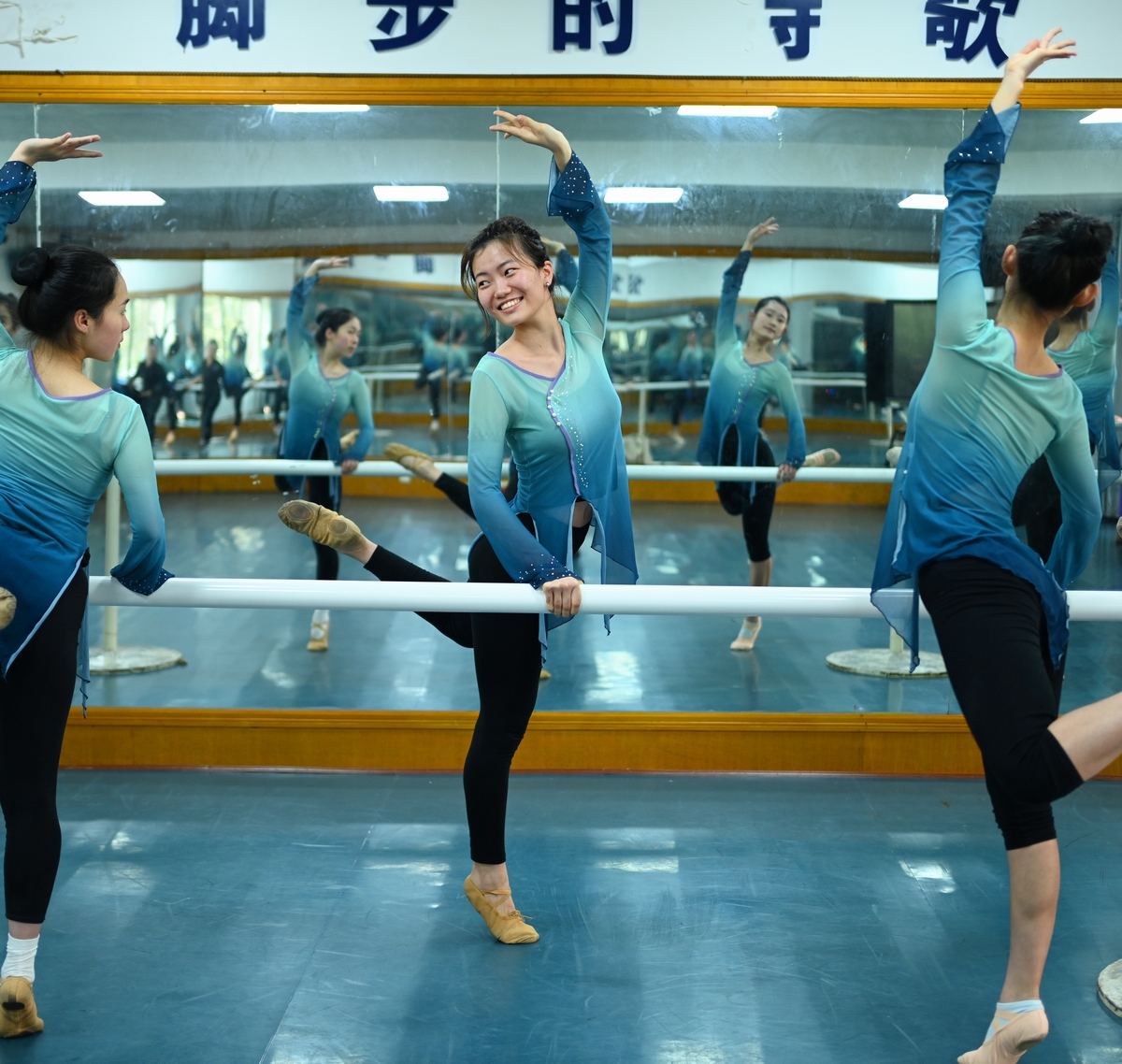 “不要撅屁股,下蹲和直立的过程要有对抗力”,3月8日,在湖南女子学院音乐与舞蹈学院的舞蹈室里,舞蹈老师罗莎正带领着学生们进行训练。
