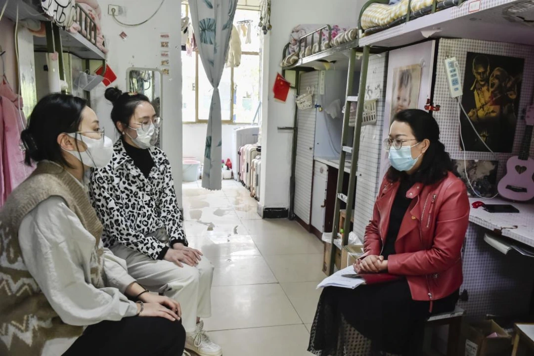 该院领导和党员教师在寝室和学生们围坐一起,聊着日常嘘寒问暖。 教师党支部书记李燕丽在与学生促膝谈心,进行个性化指导。