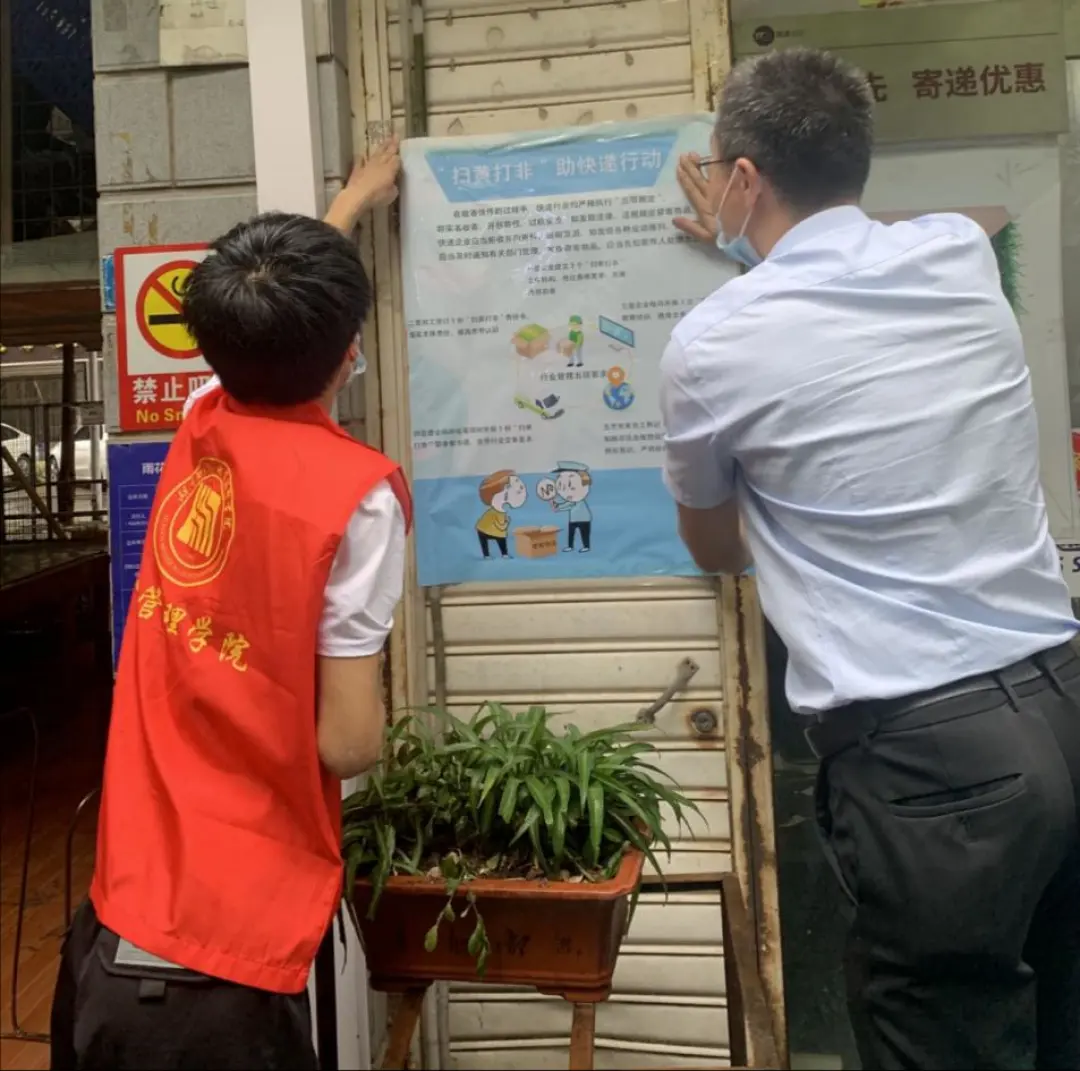 在宣传上墙活动中,学生志愿者吴丽艳和王思思看到自己设计的《扫黄打非助快递》海报贴在网点门口的醒目位置,她们还和网点负责人约定开设“扫黄打非”月度专栏,“以后我们将每个月来更新设计的海报,同时在海报上设计‘扫黄打非’的抖音宣传视频的二维码,让社区居民和快递员更关注‘扫黄打非’。”