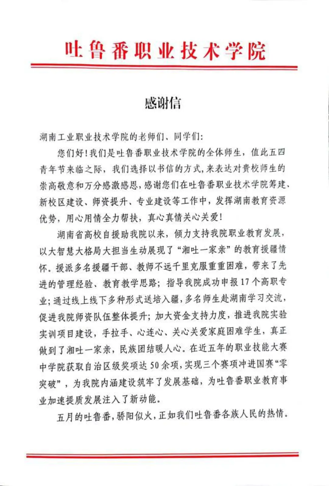 近日,湖南工业职业技术学院收到吐鲁番职业技术学院全体师生寄来的一封感谢信,字里行间对湖南工业职业技术学院为吐鲁番职业技术学院筹建、新校区建设、师资提升、专业建设等方面所产生的积极成效、突出贡献表示肯定。