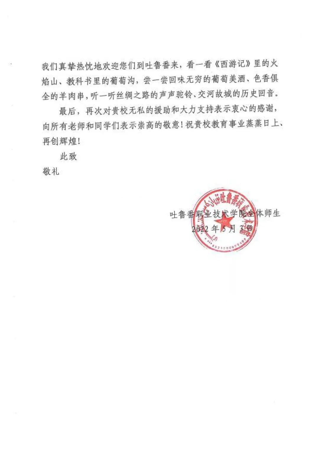“您们好!我们是吐鲁番职业技术学院的全体师生,选择以书信的方式,来表达对贵校师生的崇高敬意和万分感激感恩。”“感谢您们发挥湖南教育资源优势,用心用情全力帮扶,真心真情关心关爱!”