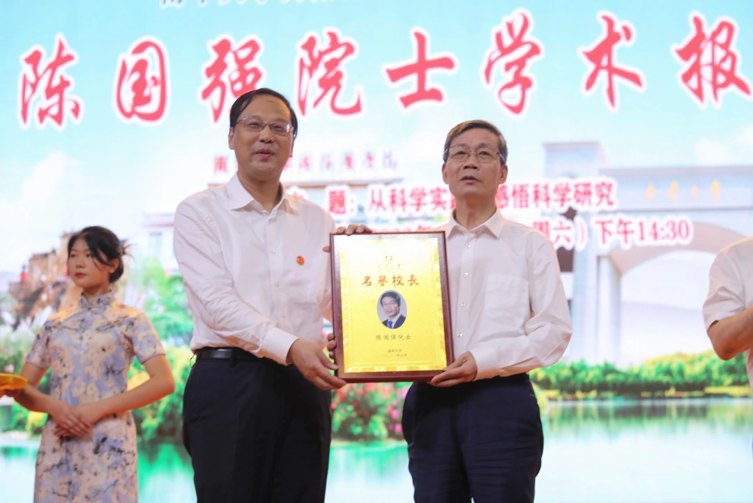5月21日,中国科学院院士、南华大学80级校友陈国强受聘南华大学名誉校长。近300名师生代表热情欢迎“陈学长”回家成为“校长”。