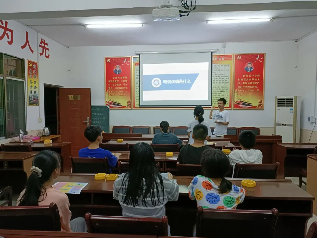 2021级网络空间安全专业的谭邦国回到了自己的家乡家住郴州宜章县关溪乡余家村,给当地中小学生作课堂讲解,同时播放了团队剪辑的反电信诈骗宣传视频。同学们积极参与互动,对各类电信诈骗手段有了细致的认识,并能够快速反应找到解决方法。