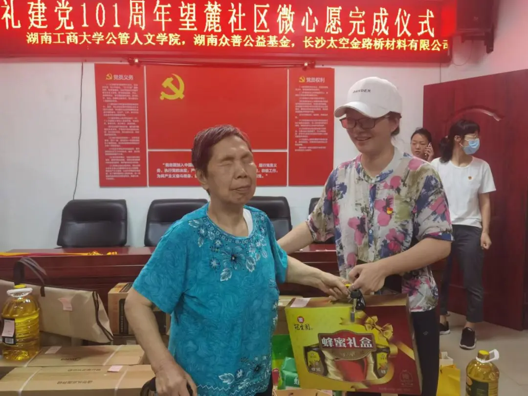 7月11日上午,湖南工商大学公共管理与人文地理学院党委书记彭学文,学院驻望麓社区第一书记李琬琼带领学院10余名教职工党员和大学生志愿者来到望麓社区,与湖南省众善公益基金会党支部、长沙太空金路桥材料有限公司共同开展党建共建活动,帮助残障居民实现家庭梦想,圆满完成了40户居民家庭的微心愿,共捐赠价值1万余元物资。