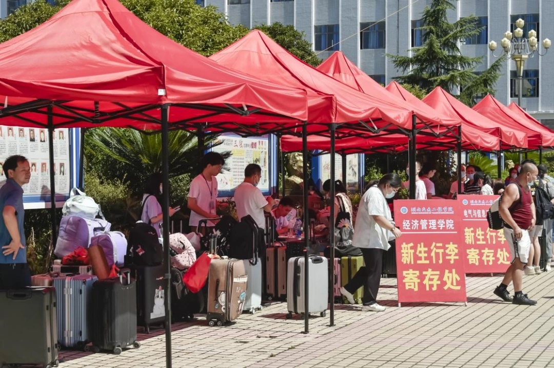 在学校绿色文化广场,迎新志愿者们顶烈日冒高温,为来自四面八方的学弟学妹们寄存行李。