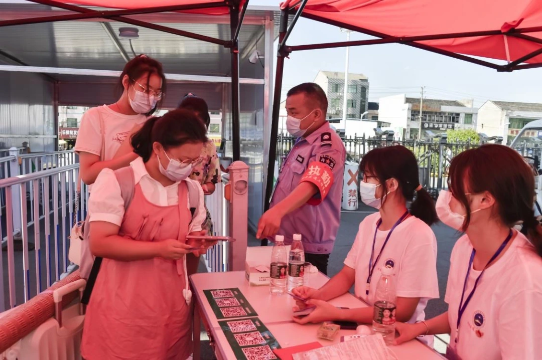 在学校大门口,迎新志愿者和保卫人员在为2022级入学报到新生验证健康码和行程码,提醒新生及家长佩戴口罩,严格把好疫情防控第一关。