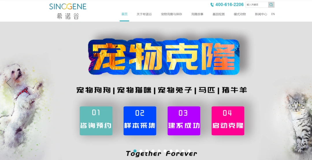 据希诺谷官网介绍,他们可以提供狗狗、猫咪、兔子、马匹、猪牛羊等动物的克隆服务,整个流程包括咨询预约、样本采集、建系成功、启动克隆等。