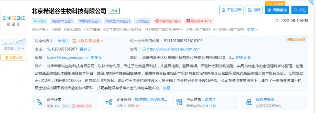 成立于2012年的北京希诺谷生物科技有限公司是国内比较知名的可提供宠物克隆服务的企业之一。希诺谷的客服人员介绍,目前,克隆猫狗的价格并不相同。克隆猫的报价是25万,现在活动价是10万。克隆狗则根据品种报价。 并且,全国都可以安排上门取样,“只要采样好了,克隆成功只是时间问题。”