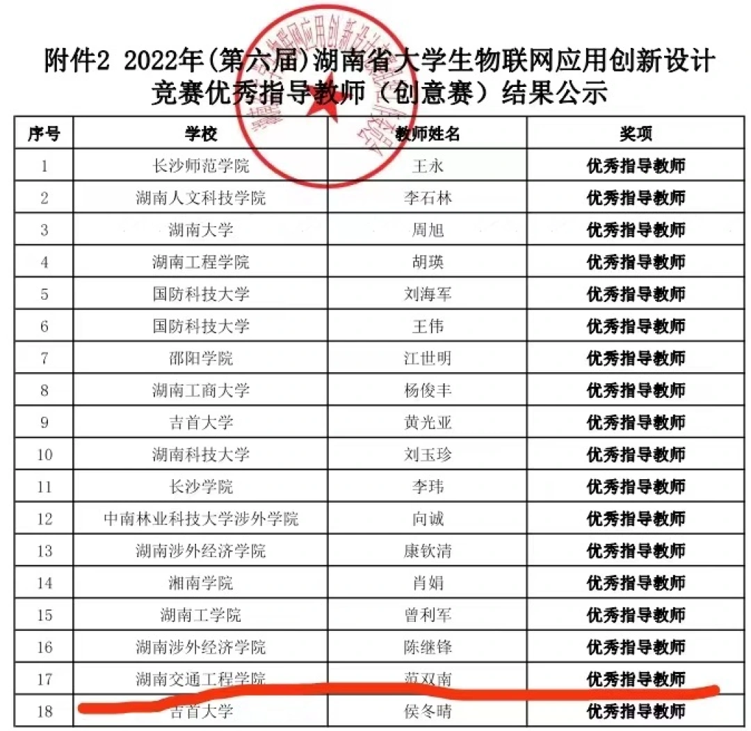 经初赛、线上决赛答辩、竞赛专家组审核通过,评选创意赛一等奖18项、二等奖24项、三等奖30项;同时评出2022年(第六届)湖南省大学生物联网应用创新设计竞赛优秀指导教师18名(创意赛)。