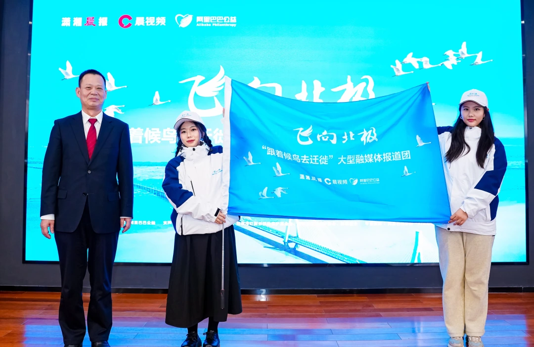 在本次仪式的最后,刘亚楼为潇湘晨报·晨视频大型融媒体报道团授旗。“飞向北极——跟着候鸟去迁徙”大型融媒体报道在这个春天正式启幕。