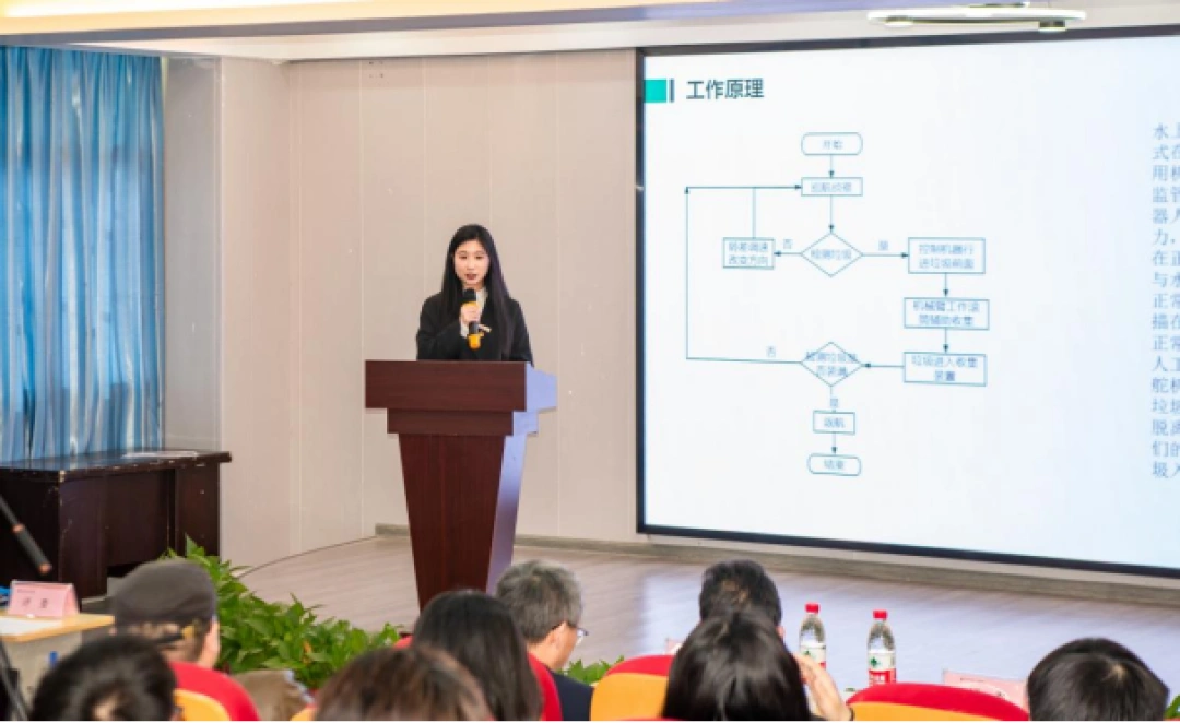竞赛现场,各参赛团队精神饱满,结合理论知识与实践操作,紧跟时代热点和科创趋势,通过作品陈述、PPT和实物展示,全方位展示作品科研成果、优势特色和社会意义等方面内容。学校特邀校内外五位资深专业评委根据参赛作品的文本内容、现场汇报及随机答辩等情况进行综合评审,并对参赛作品进行现场点评,提出意见和建议。