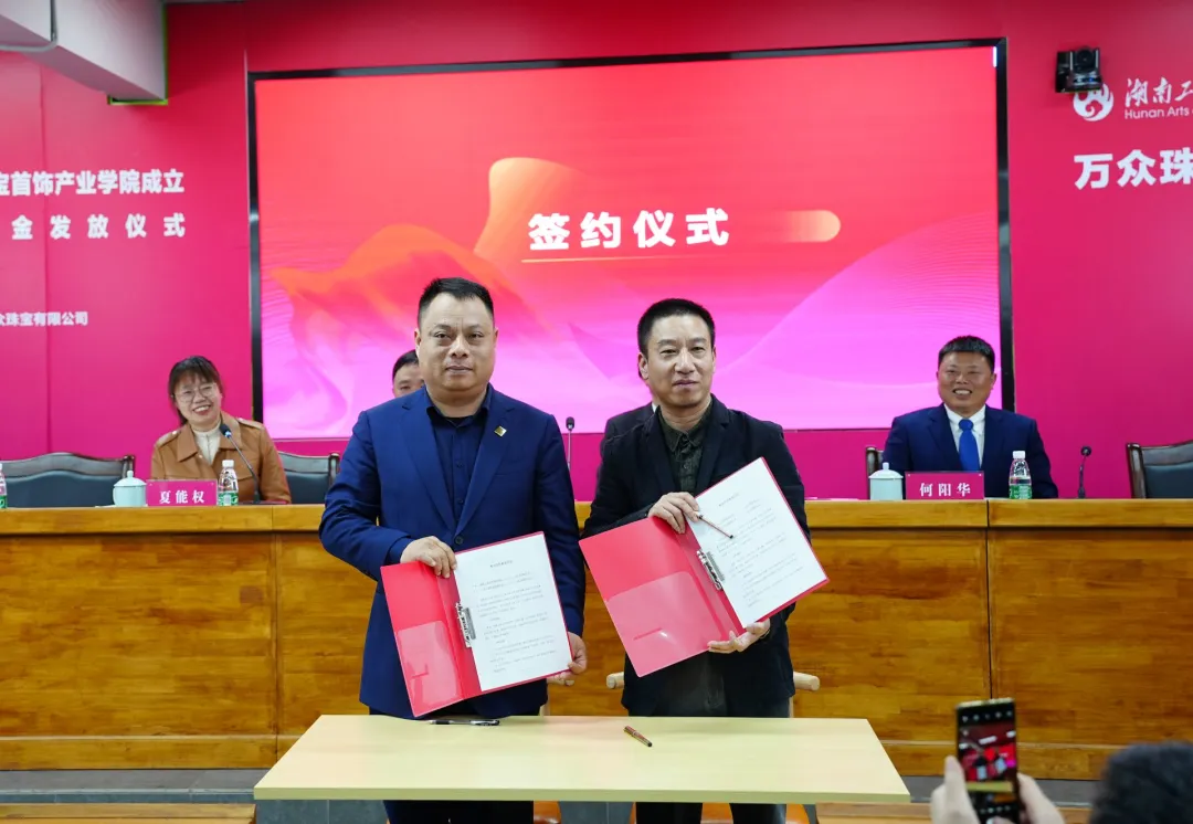 仪式现场,陈鸿俊、何阳华共同为万众珠宝首饰产业学院揭牌。刘英武与刘卓签订了《共建产业学院战略合作框架协议》。