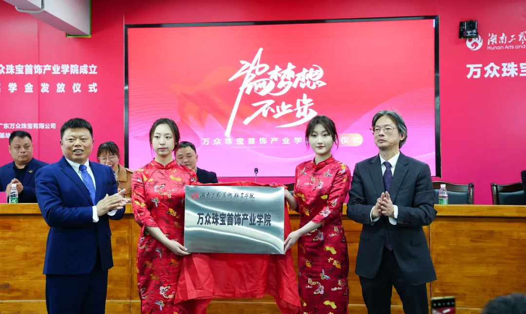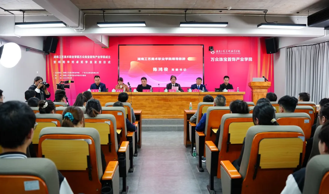 为进一步深化校企合作,推进产教融合,4月6日上午,湖南工艺美术职业学院万众珠宝首饰产业学院成立暨2022年何阳华、刘卓奖学金发放仪式在湖南工艺美术职业学院长沙基地举行。湖南省教育厅职成处四级调研员、副处长王宇,湖南工艺美术职业学院党委书记陈鸿俊、校长夏能权、副校长刘英武,广东万众珠宝有限公司董事长何阳华、总经理刘卓等领导嘉宾出席成立仪式。仪式由夏能权主持。