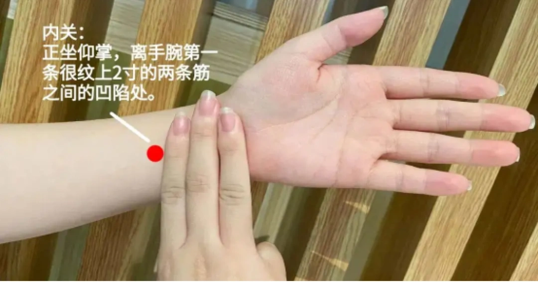 (4)非药物治疗:湖南中医药大学第一附属医院肿瘤科目前已开展多项中医治疗手段,如穴位注射治疗、穴位贴敷治疗、隔物灸、耳穴压豆等,经过长期的临床实践,取得了一定的临床疗效,对患者的消化道反应有明确的改善作用。对于化疗结束在家休养的患者,如果出现恶心呕吐等消化道反应,可以按压内关穴,内关穴被称为“止呕要穴”,取穴方法也很简单,将掌心向上,您就会看到手腕处有很多条横纹,从手掌到手臂的方向开始数,取第二条横纹的正中点,由此往手臂方向量,大约三根手指并齐的宽度,在两根筋的正中间,就是内关穴,两侧交替按压,每次3-5分钟,每天3次左右即可。