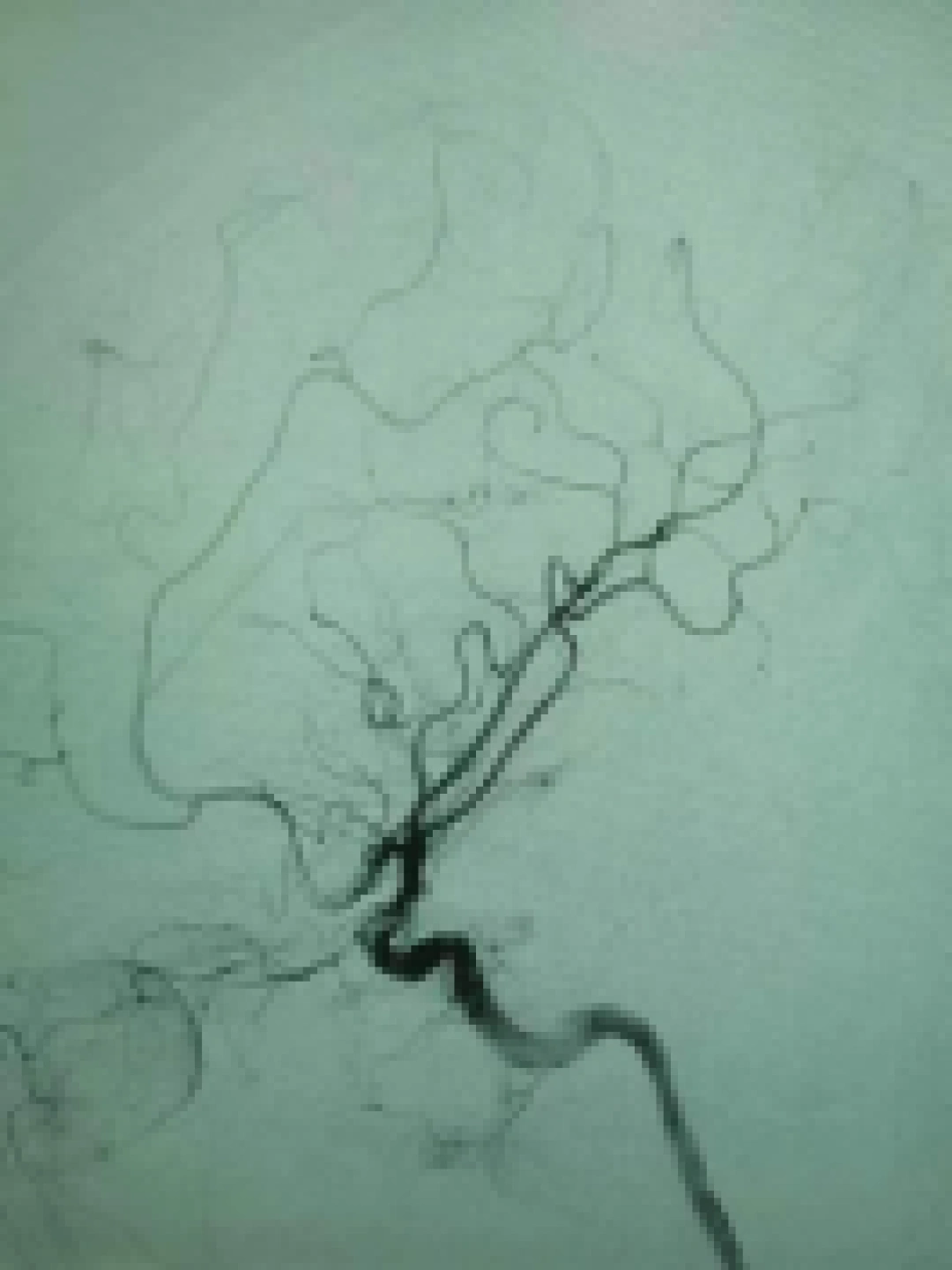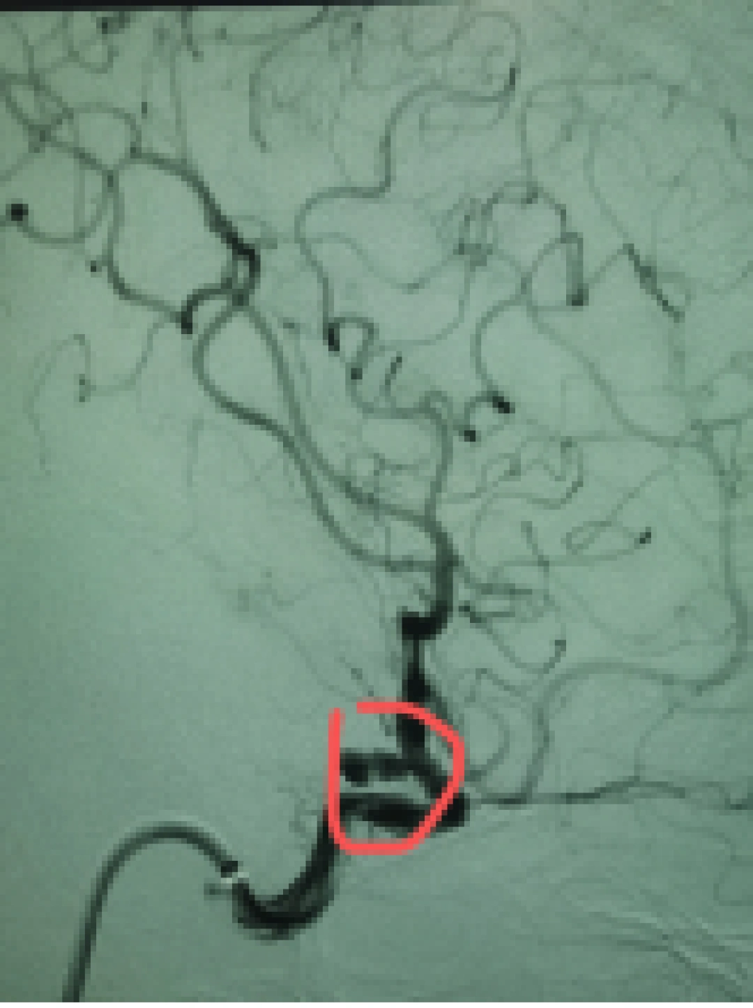 △脑血管造影术示动脉瘤栓塞术后