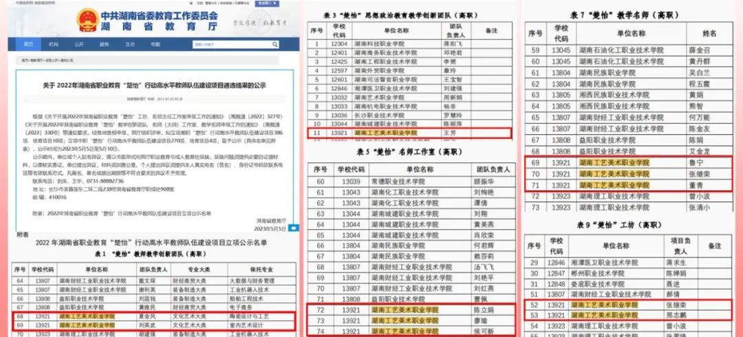 近日,湖南省教育厅发布《关于2022年湖南省职业教育“楚怡”行动高水平教师队伍建设项目遴选结果的公示》,湖南工艺美术职业学院申报的11个项目全部成功入选,立项成功率为100%。其中,立项“楚怡”教学创新团队3项、“楚怡”名师工作室3项、“楚怡”教学名师3项、“楚怡”工坊2项。