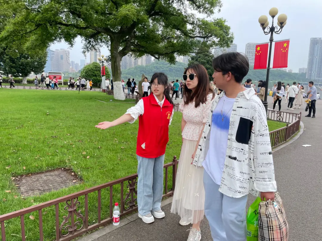 19岁的文欣也是雷锋志愿者中的一员,她是湖南女子学院商务英语专业的一名大一学生。从入校后没多久,她就报名成为了一名志愿者,不光周末会来橘子洲上提供志愿服务,刚刚过去的五一小长假,她也没休息,在橘子洲和烈士公园提供志愿服务。“我进入大学之前,就很想加入到志愿者的行列中来,希望自己能够帮助到更多的人。”文欣说,做志愿者最锻炼人的就是社交能力,本来她还有点“社恐”,以前与人交流都是通过手机,做了志愿者之后,她也慢慢克服了“社恐”的心态,遇到比她更“社恐”的同学,她还成了那个“社牛”志愿者。