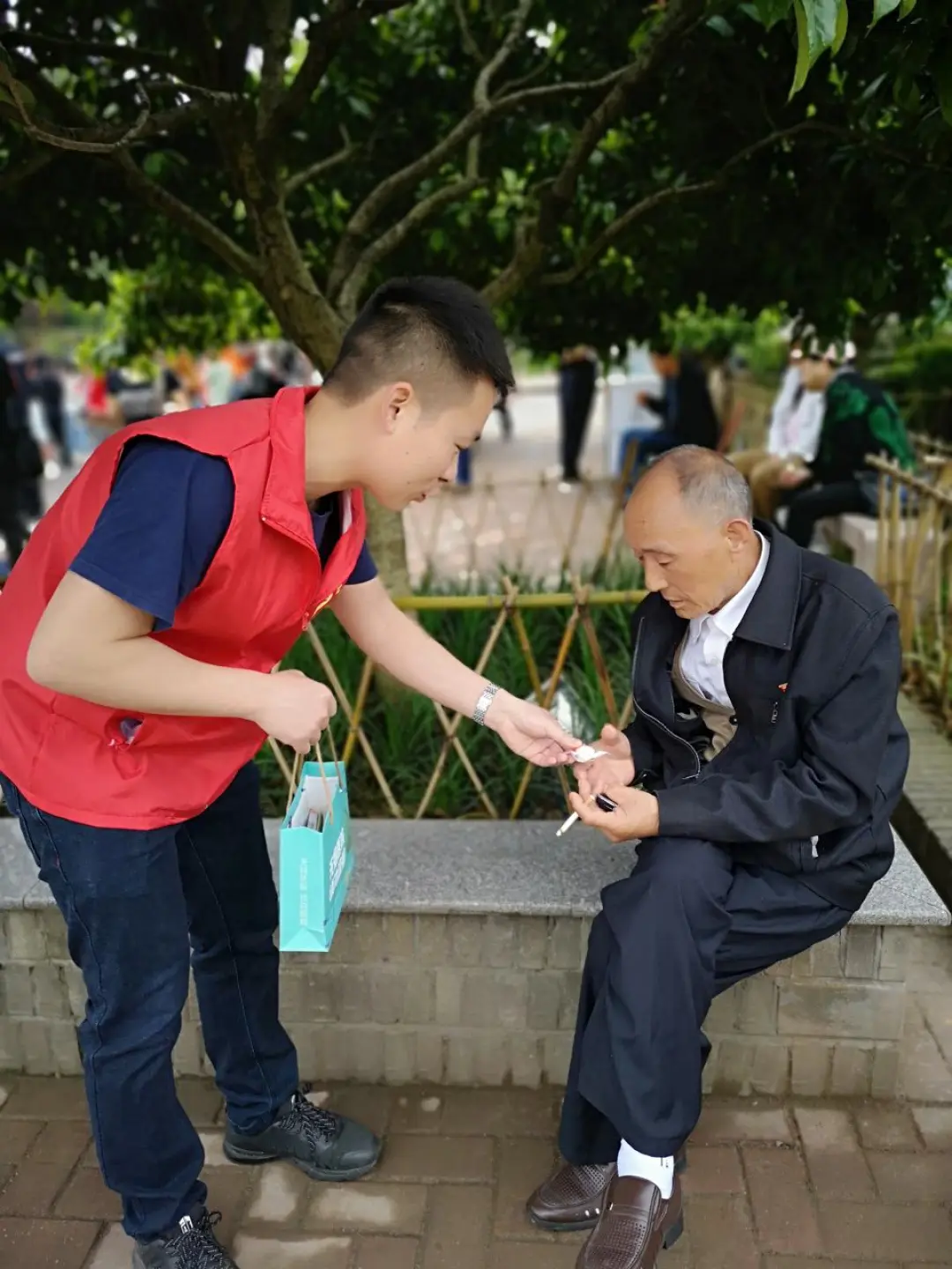 “您好,橘子洲景区是无烟景区,请您熄灭香烟,谢谢您的配合。”5月31日中午,穿着红马甲的雷锋志愿者揭璇正在橘子洲头劝阻几位吸烟的男性游客。在志愿者的提醒下,这几位游客非常配合,迅速掐灭了手里的香烟。