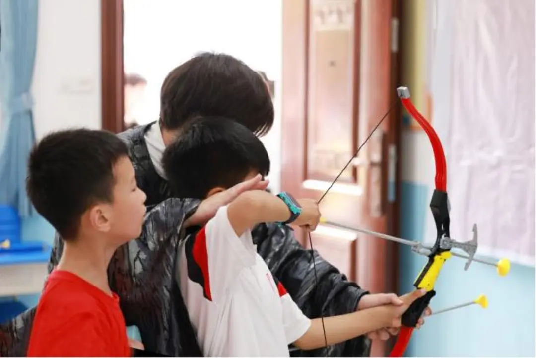 “捏住剑尾,然后弯弓拉满。”5月31日下午,在长沙理工大学子弟学校的主题教室里,一群小朋友正在一名身着汉服的大哥哥指导下练习射箭。