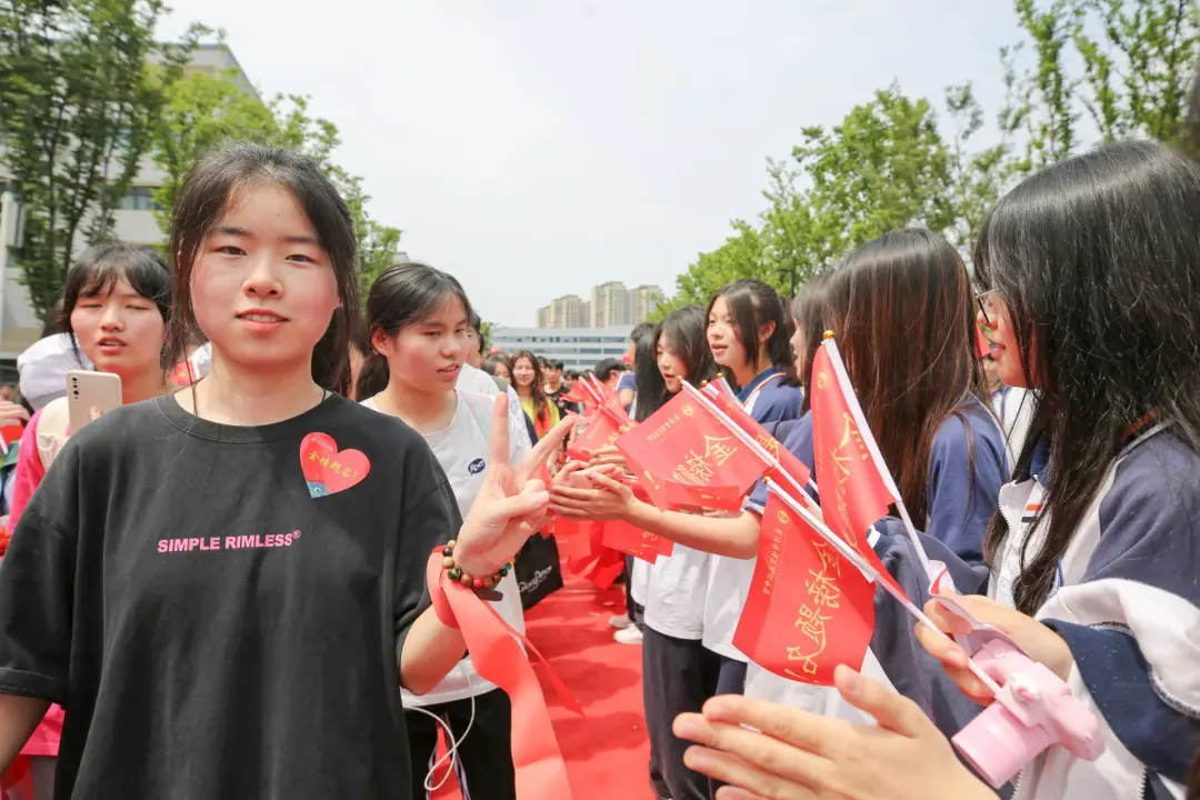 仪式现场,到处都是“好寓意”。1500个红色小旗帜在现场舞动,上面写着“勇攀高峰、超越自我、加油加油!”现场还有2000个红色“心形贴”,印有“金榜题名”“高考必胜”“加油”“旗开得胜”。大家把心形贴或贴在脸颊上,或贴在胸前,还有不少学生把“好寓意”的贴纸贴在老师们衣服上,互相倾诉着祝福与不舍。