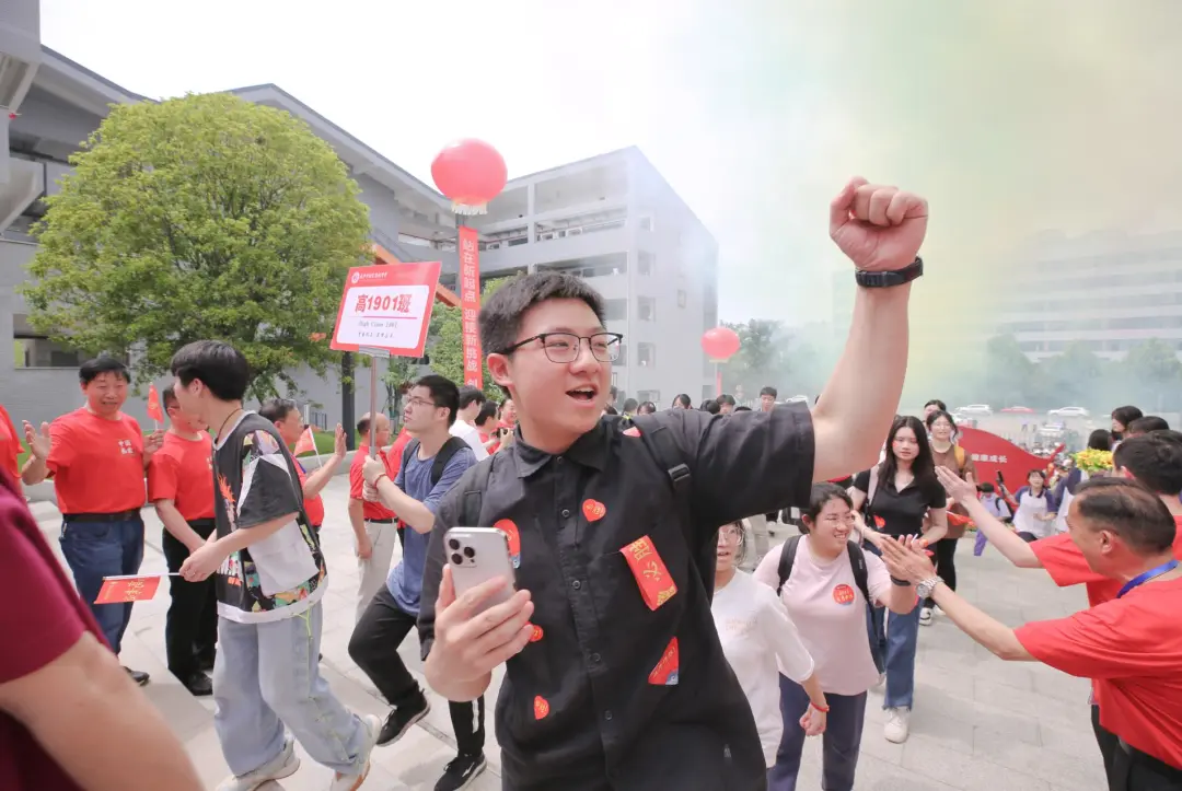 出征仪式上,长沙恒定中学999名同学蓄势待发。高一高二学生在“成功门”两侧夹道欢送,在一条大红色舞龙穿过“成功门”之后,出征学子们手举红色小旗帜,衣服上贴着红色“心形贴”,与穿着红色文化衫的老师们击掌之后走过“成功门”,期待收获高考的胜利。