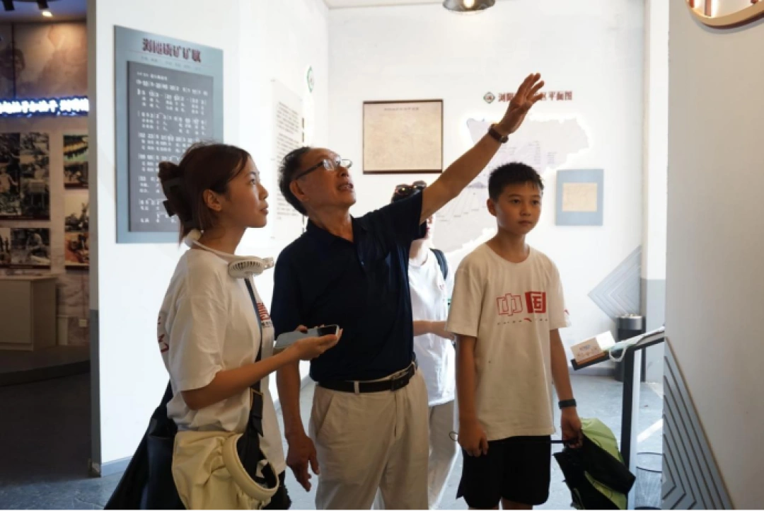 浏磷历史陈列馆坐落在永和电影小镇景点中心,浏阳磷矿永鑫社区老年协会会长张祝生为师生志愿者担任义务讲解员。年近八旬的张祝生在上世纪六十年代进入浏阳磷矿工作,见证了它的一大段历史。他在每一个陈列点仔细讲解企业的故事,将大家带入了当年艰苦奋斗的历史场;接着,又带领志愿者参观了磷矿工人俱乐部。