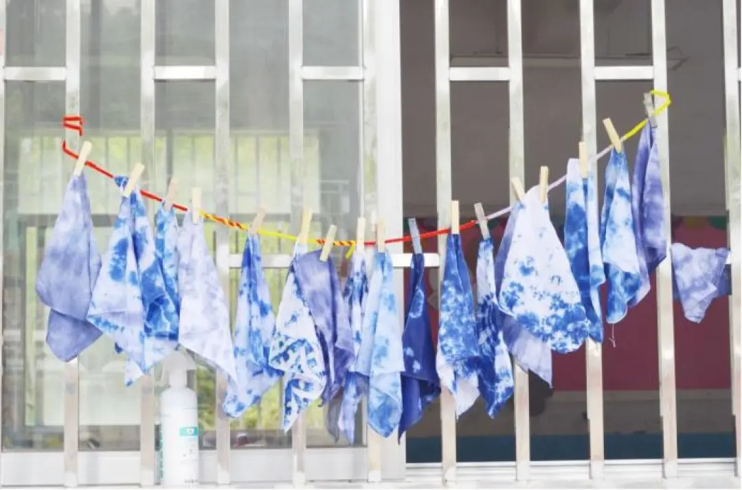 经过近20分钟的静置后,孩子们“开盲盒”一般打开自己的作品。这些作品颜色深浅不一、各具特色:有颜色较深的藏青蓝,有白底带蓝的青花色,有浅蓝紫的雪青色;有的像一片烟云,有的像朵朵浪花,有的像块草地……每个孩子都做出了颜色独一无二的扎染作品。