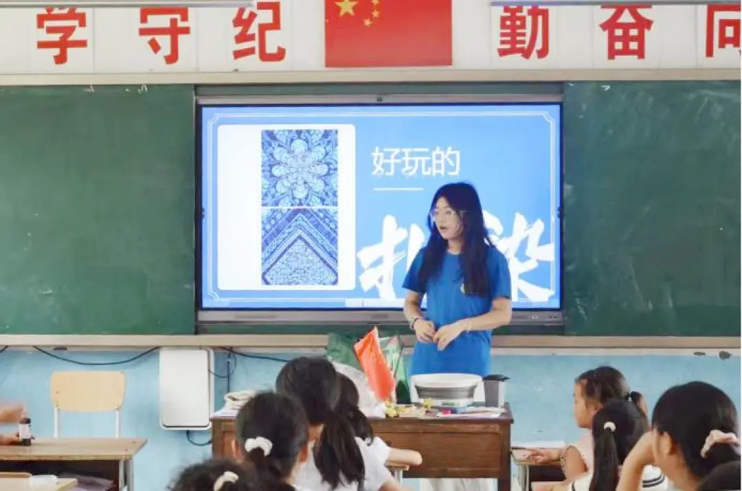 近日,长沙理工大学物理与电子科学学院“小小科学家·科普创造营”社会实践团来到怀化市芷江侗族自治县五郎溪乡五郎溪村五郎溪小学。在教室里,志愿者们为小朋友带来了一堂别开生面的扎染科普手工课。