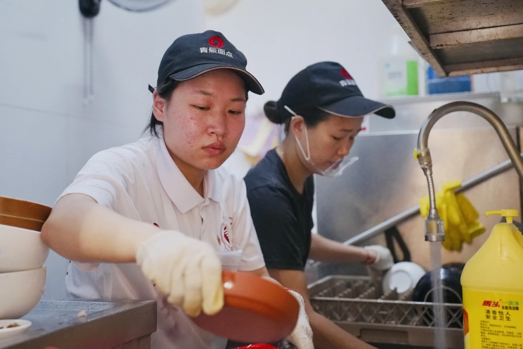 7月24日中午12点,位于营盘路的青辰面点迎来了许多顾客。李声是众多忙碌的身影之一,她负责在水池台旁洗碗、洗菜,不时有需要被清理的碗送到窗口,正值饭点,李声也难得休息。