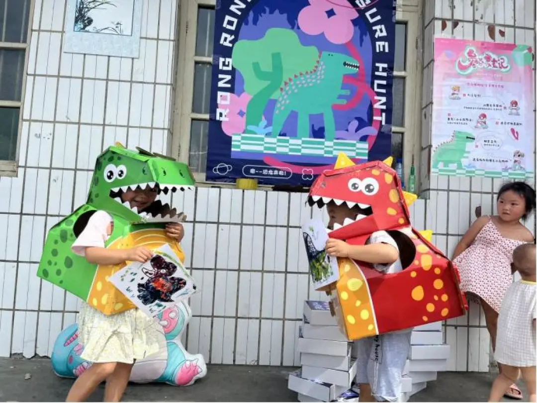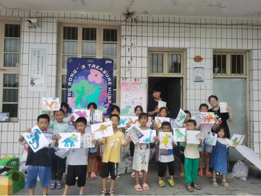 小朋友们天马行空、自由创作。不一会儿,五花八门、配色鲜艳大胆的画作相继问世,并穿上恐龙服饰打卡拍照留念。课堂上,孩子们还收到了由实践团亲手设计制作的以无牙芙蓉龙“蓉蓉”为IP形象的抱枕、服饰、贴纸等系列文创产品,惊喜连连。