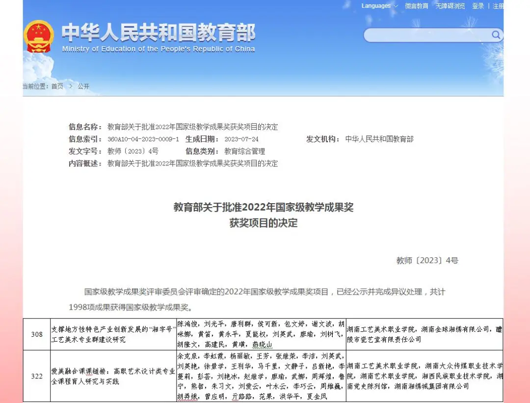 近日,教育部发布《关于批准2022年国家级教学成果奖获奖项目的决定》(教师〔2023〕4号),湖南工艺美术职业学院喜获2项职业教育国家级教学成果奖。
