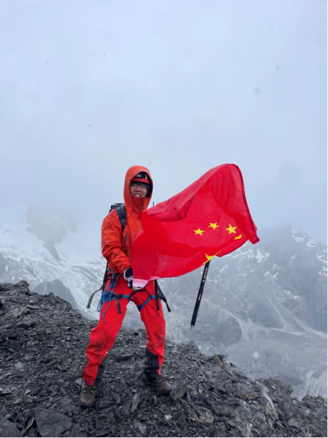 今年暑假,长沙理工大学文学与新闻传播学院大二学生林天烁发了一条朋友圈。视频中,他站在一处陡峭的碎石山顶上迎着山风展开了五星红旗,远处是壮丽的雪山、身边是氤氲的云雾。