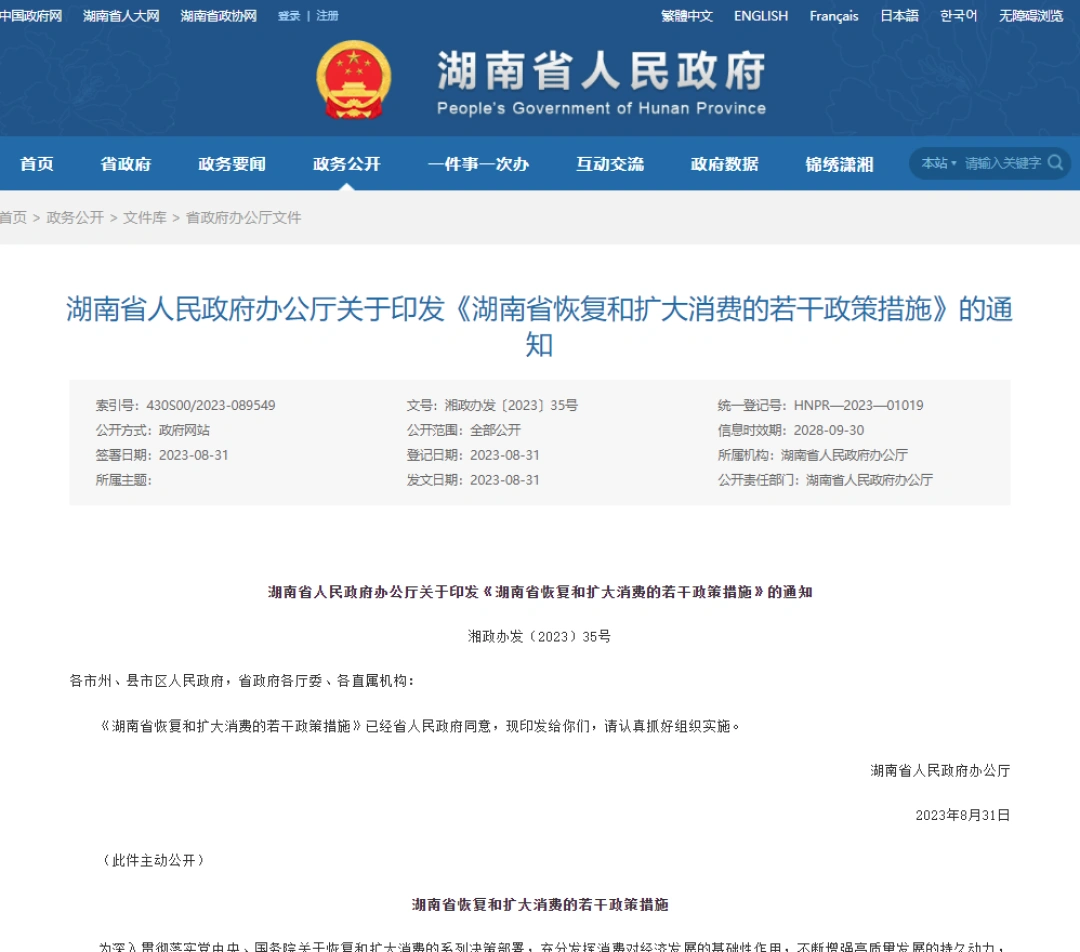 据湖南省政府门户网站消息,湖南省人民政府办公厅印发《湖南省恢复和扩大消费的若干政策措施》,全文如下: