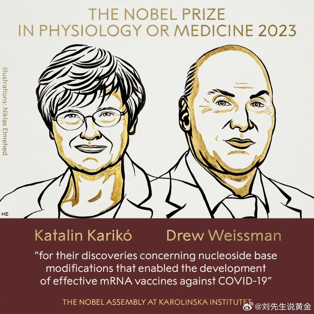 瑞典卡罗琳医学院宣布,将诺贝尔生理学或医学奖授予Katalin Karikó、Drew Weissman,以表彰他们在核苷碱基修饰方面的发现,这些发现使得针对COVID-19的有效mRNA疫苗得以开发。