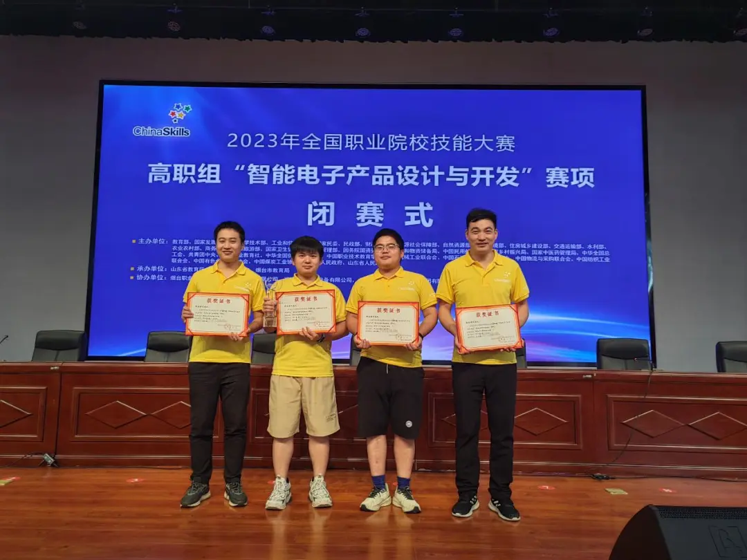 近日,2023年全国职业院校技能大赛高职组“智能电子产品设计与开发”赛项在山东闭幕,湖南工业职业技术学院教师赵自鹏和学生刘志华、廖广、罗从善组成参赛队代表湖南省参赛,经过两天紧张激烈的比赛,从全国59支代表队中脱颖而出,荣获一等奖。