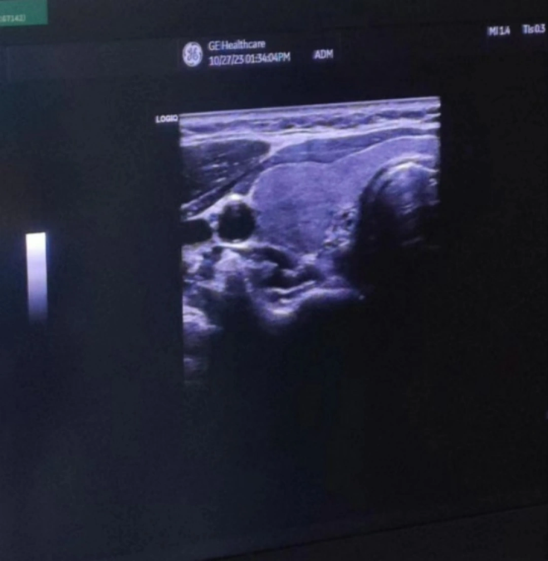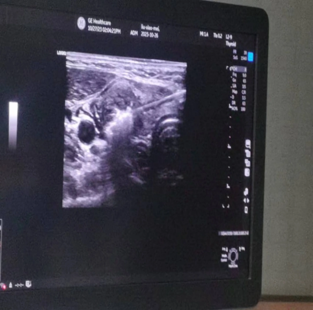10月30日,内分泌科主任张海涛组织甲状腺疾病多学科治疗团队乳甲外科主任曾晓晨、超声科主任刘友员、病理科医师范冶、内分泌科副主任医师刘薇共同讨论后,为患者行甲状腺结节微波消融手术。