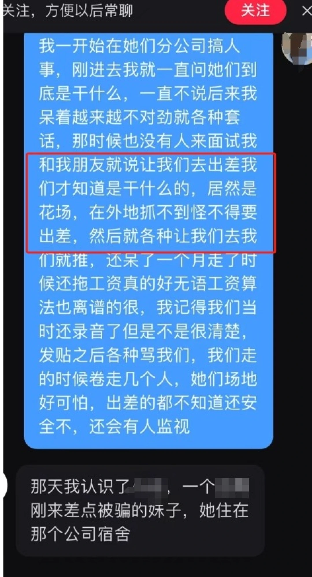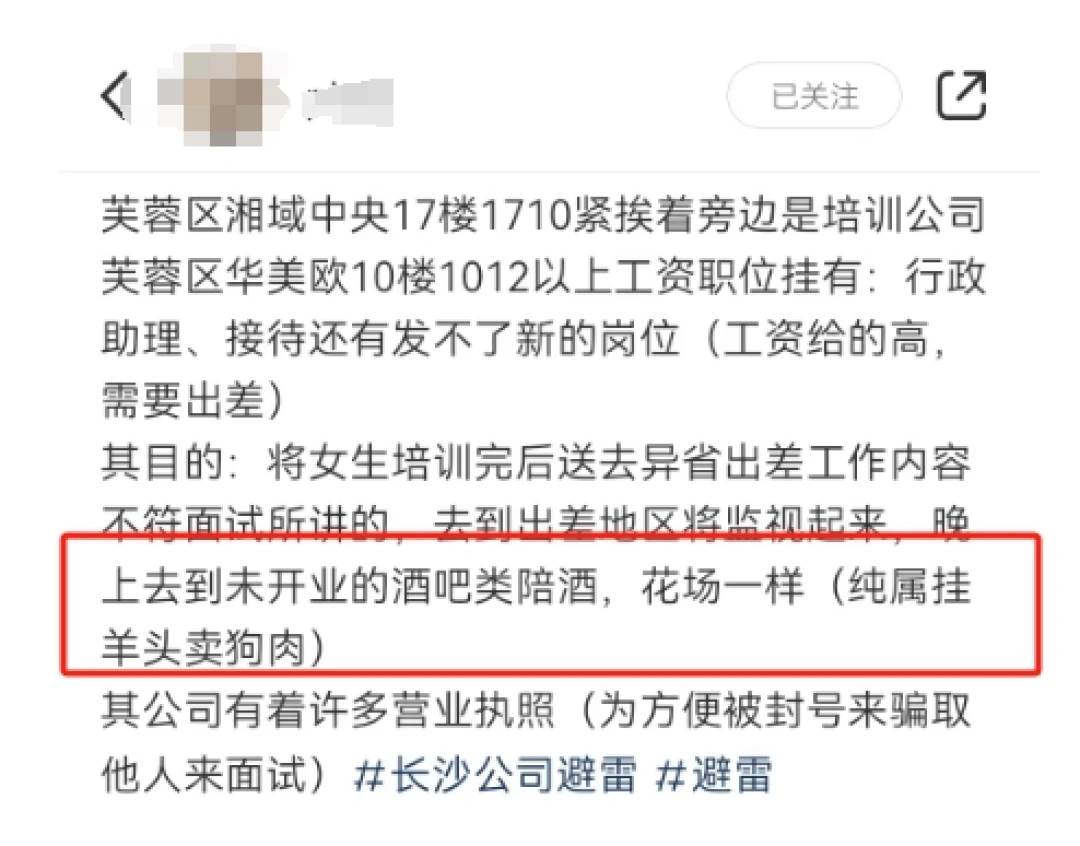 在社交媒体小红书上,也有网友分享了类似经历。这名网友称,长沙一些公司发布“行政助理”“接待”等岗位吸引女性应聘者,而实际上是将女生培训完送到外省“出差”,工作内容与面试时讲的完全不符。