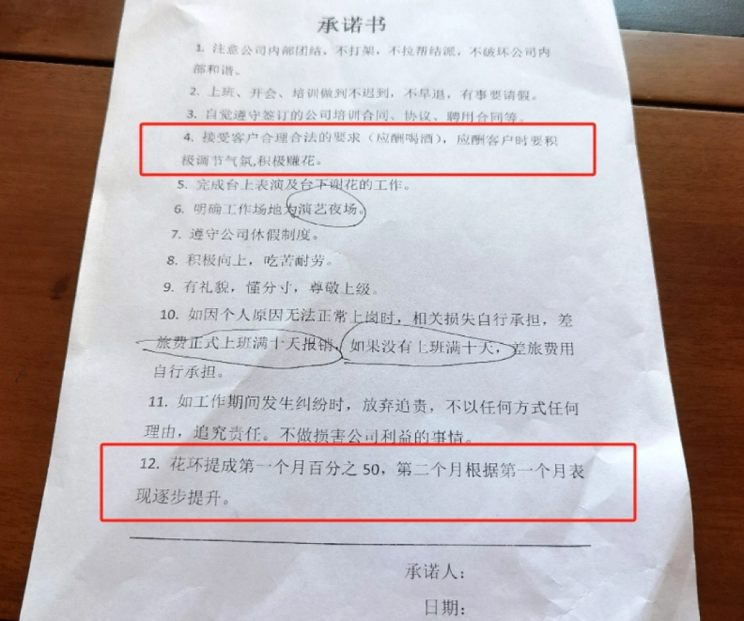 而直到记者面试3天后正式与签订合同之前,长沙扬梦公司工作人员才拿出了一份“承诺书”,承诺书中载明上岗后要“接受客户合理合法的要求(应酬喝酒),应酬客户时要积极调节气氛”,“明确工作场地为演艺夜场”。