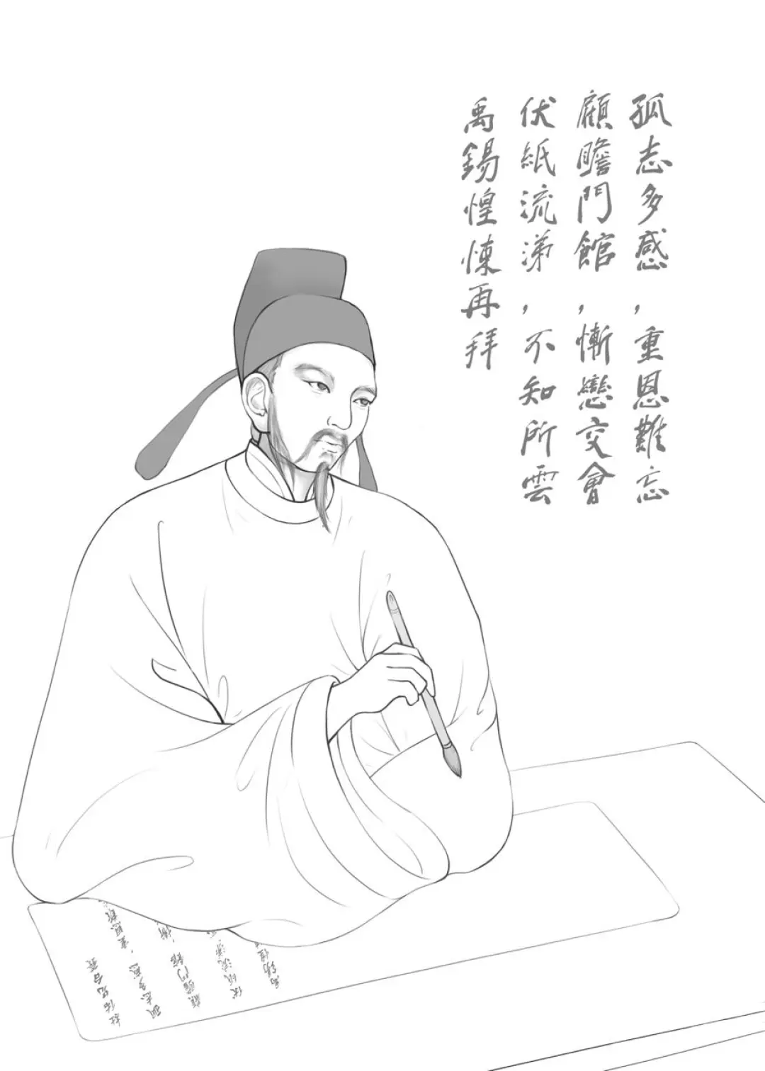 李松林画刘禹锡缘由是给《刘禹锡朗州故事集》配插画。这本书是由常德市刘禹锡研究会主编的系列丛书,以刘禹锡在朗州担任司马期间的故事为主体,讲述了86个关于刘禹锡的故事。今年6月,学校一位老师找到李松林,想要他为这本书画几幅插画,他二话没说立马答应了。