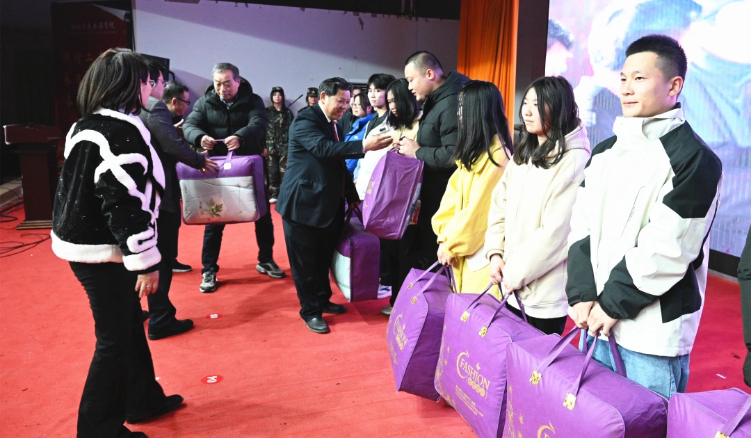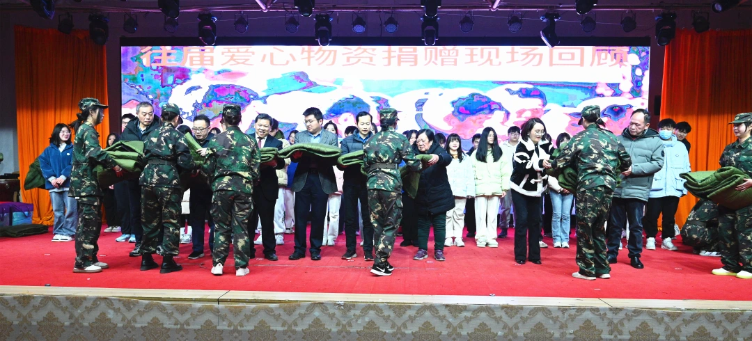 学校党委书记刘文君,名誉校长刘平娥、党委副书记冯良贵,副校长余孟辉、刘义伦,董事董烨卉等领导出席捐赠仪式并亲自为学生发放棉衣棉被。学生工作处、校团委等处室负责人,各二级学院党总支书记,全校辅导员,全体受助学生参加活动。