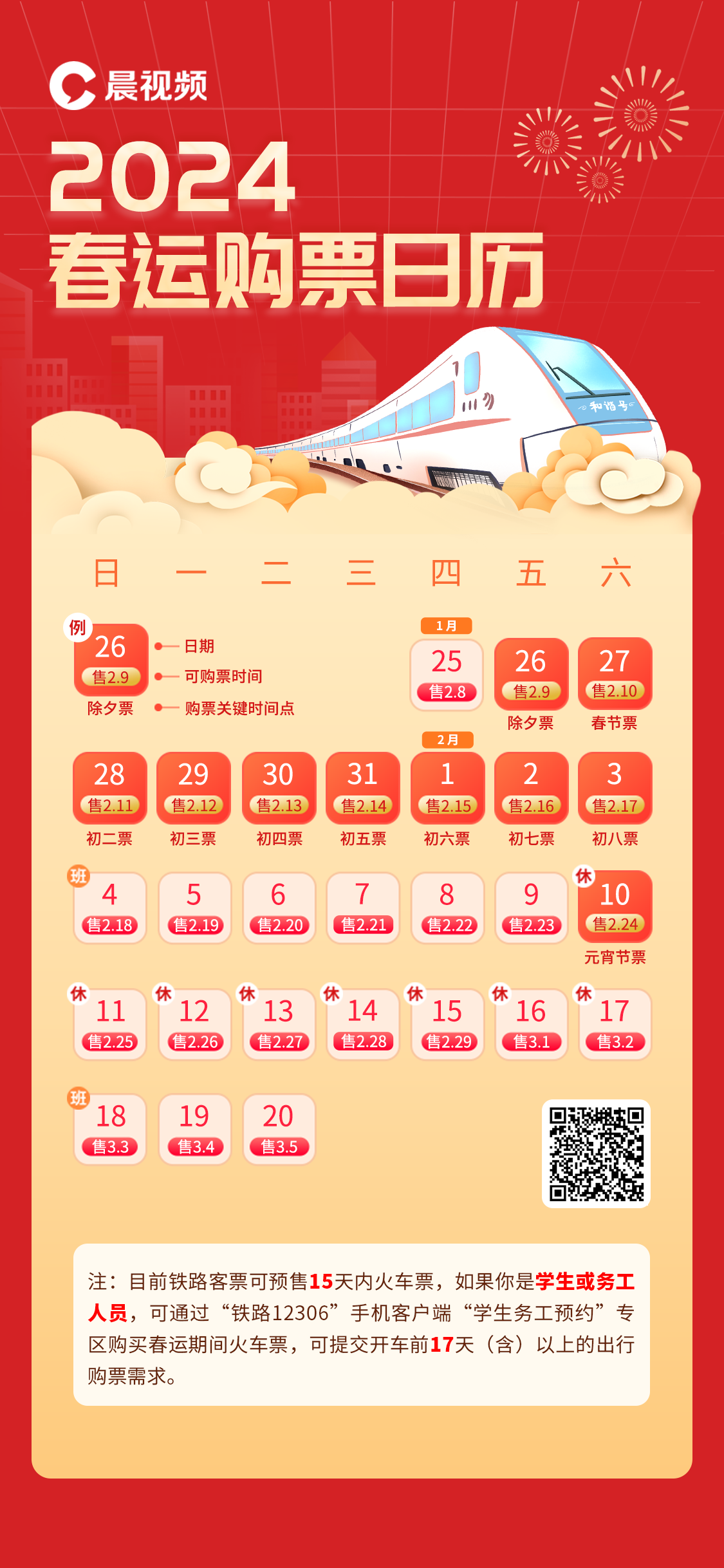 注:目前铁路客票可预售15天内火车票,如果你是学生或务工人员,可通过“铁路12306”手机客户端“学生务工预约”专区购买春运期间火车票,可提交开车前17天(含)以上的出行购票需求。(专区开放时间为2024年1月10日至2月19日。)