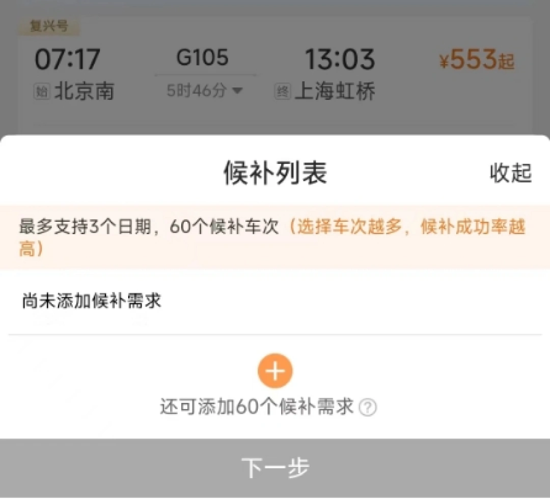 开售时如果没有抢到票,可以通过官方的车票候补功能继续抢票。