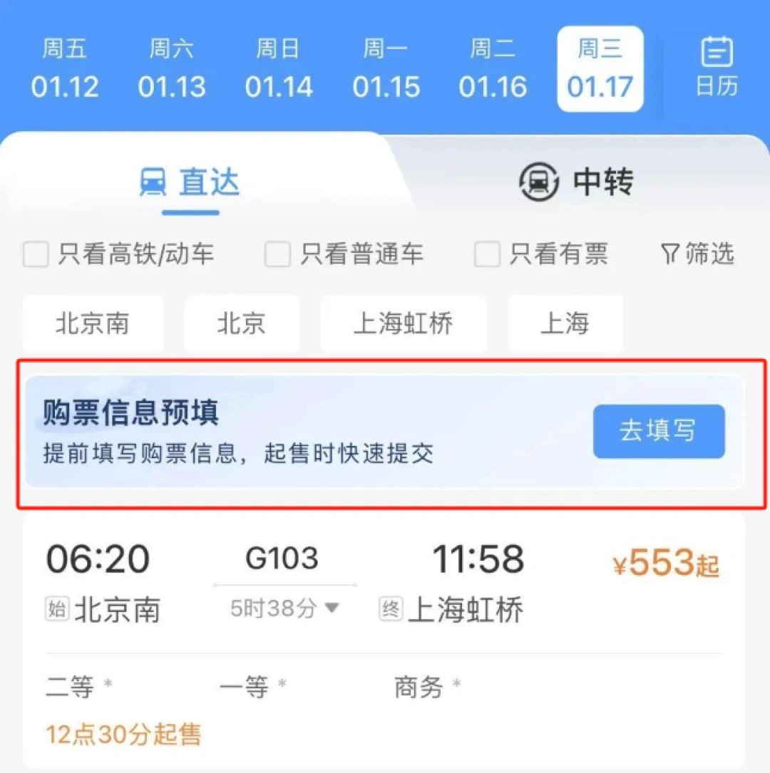 旅客朋友可于车票起售当日,预先填写乘车人、车次、席别等信息,在车票开始发售时一键提交订单并完成支付。