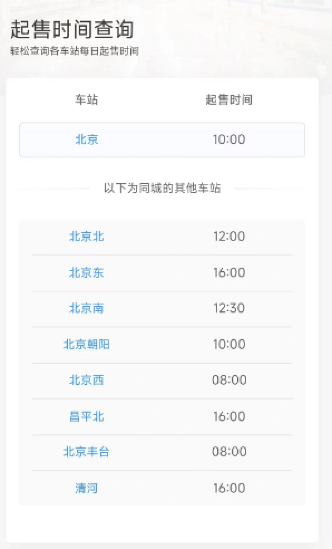 ※提醒:即使是同一个城市,不同车站的起售时间也可能不一样,请提前查询确定购票时间。