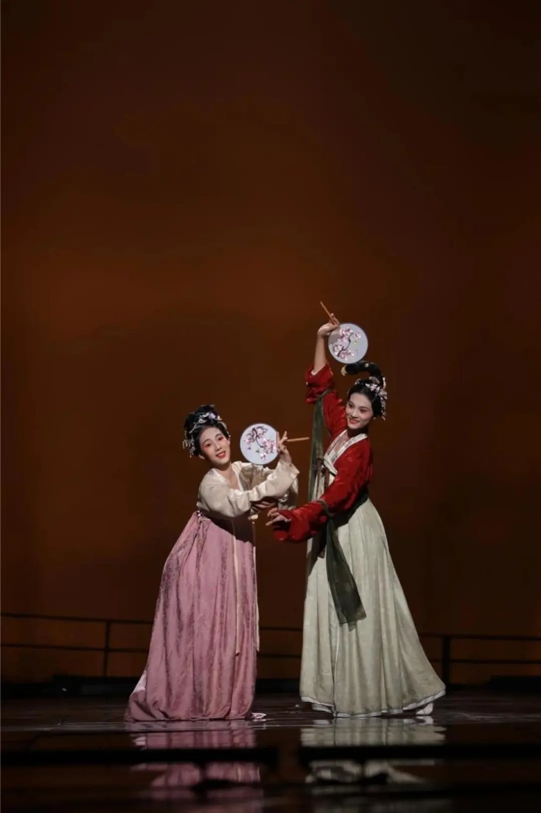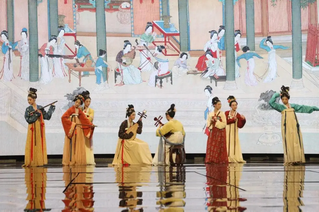 演出中,师生创造性地采用沉浸式人物造型艺术,借助舞台表演的方式,将中国古代传世名画《汉宫春晓图》活灵活现地“复刻”出来,画中人仿佛“出画入戏”一般,演员们优美的身姿、极富古韵的造型、灵动飘逸的表演,让观众更直观地领略到汉代宫廷春色满园的浪漫景象。