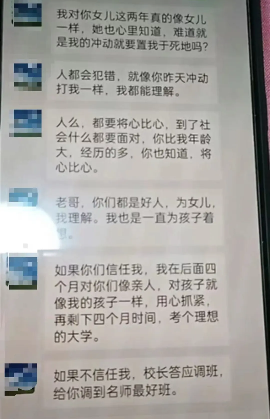 文章提到,网女孩打电话告知了父亲,次日放寒假后,由父亲与马某林交涉。在马某林与父亲的聊天截图中,他多次表示“我对你女儿这两年,真的像女儿一样”、“如果你信任我,接下来四个月,对孩子我会像对自己孩子一样;如果不信任我,校长答应调班”、“要我死了她就解气了”……