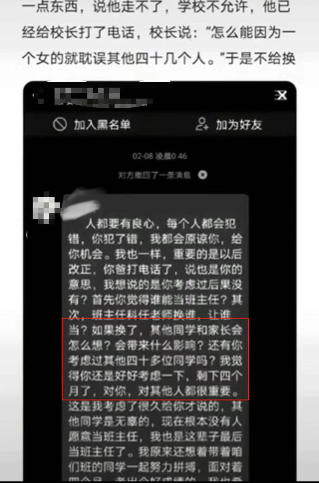 在马某林于2024年2月发送给该网友的多条短信中,他提到,“人都要有良心,你犯了错,我都会原谅你,给你机会。我也一样,重要的是以后改正……班主任、科任老师换谁?你考虑过其他四十多位同学吗?剩下四个多月了,对你、对其他同学都很重要……你要考虑后面的后果和影响……”