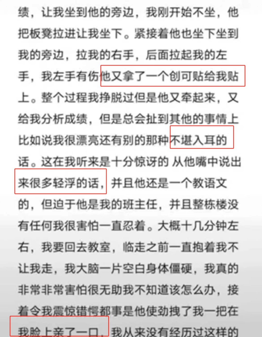 该文章显示,当事人自称是吴堡中学高三的学生,被班主任马某林叫到办公室,以分析成绩为由让她坐在旁边。“他拉我的右手,后面拉起我的左手,我左手有伤,他又拿了一个创可贴给我贴上。整个过程我挣脱过但是他又牵起来。又给我分析成绩,但是总会扯到其他的事情上,比如说我很漂亮,还有别的不堪入耳的话。”