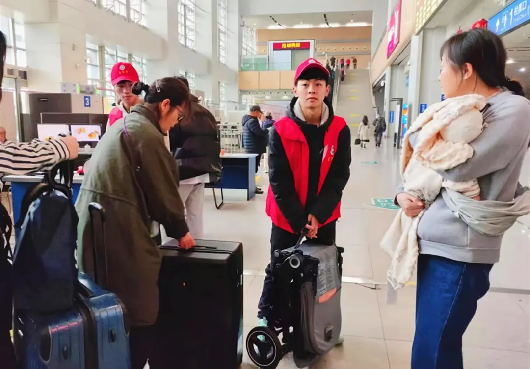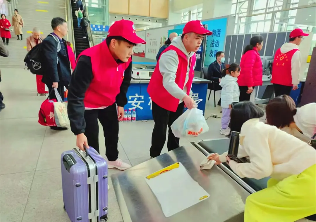 活动中,身穿红马甲的大学生志愿者们有条不紊地为进站出站的旅客们提供交通引导、购票咨询服务,还热心地帮助旅客提拿行李。