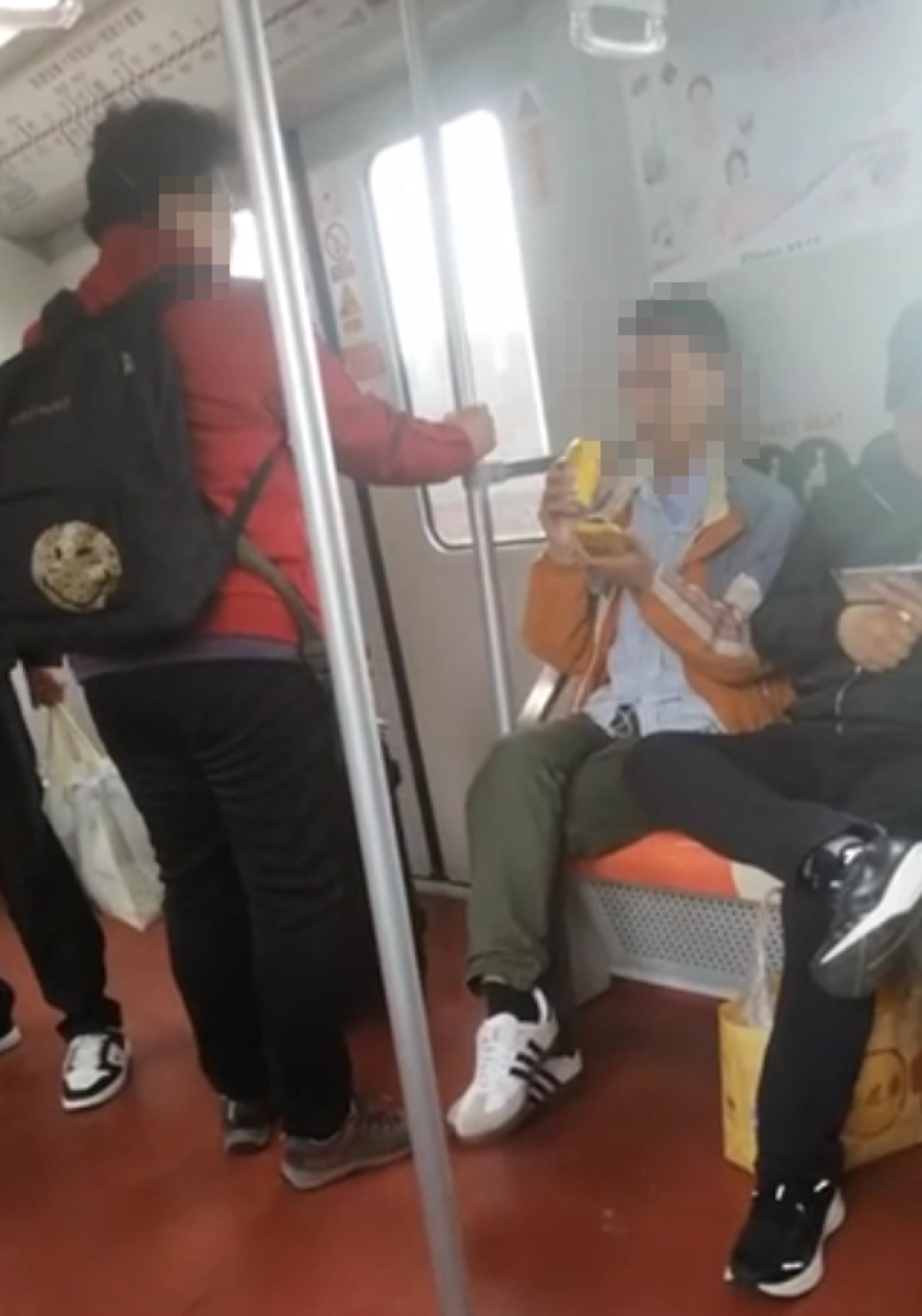 网传视频显示,年轻小伙戴着耳机、坐在地铁座椅上玩手机,身后有老弱病残孕的标识。他的前方,一名身穿红色上衣的年长女子称,“没有家教,你好意思,你这样坐着”。小伙称,“我买票了,我自己坐这怎么了”,“你给我退钱我绝对让给你”,而红衣女子回复称“你要让人家”、“这个位置不是你应该坐的”,并且拿出了证。